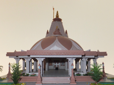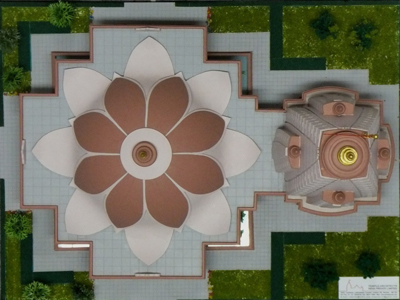 Grand Lotus shaped Shiva Temple with 18' x 18' Garbha Griha and 50' x 50' Sabha Mandap with Entrance Porches from three sides. 4Nos. big Lotus Ponds around Sabha Mandap adding cooling effect to body and mind. Blossoming lotus flowers will definitely create smoothing effect to eyes and hearts also. Half round dome is designed above Sabha Mandap which is covered with inverted lotus flower. superbly designed landscape will enhance the loveliness of temple.